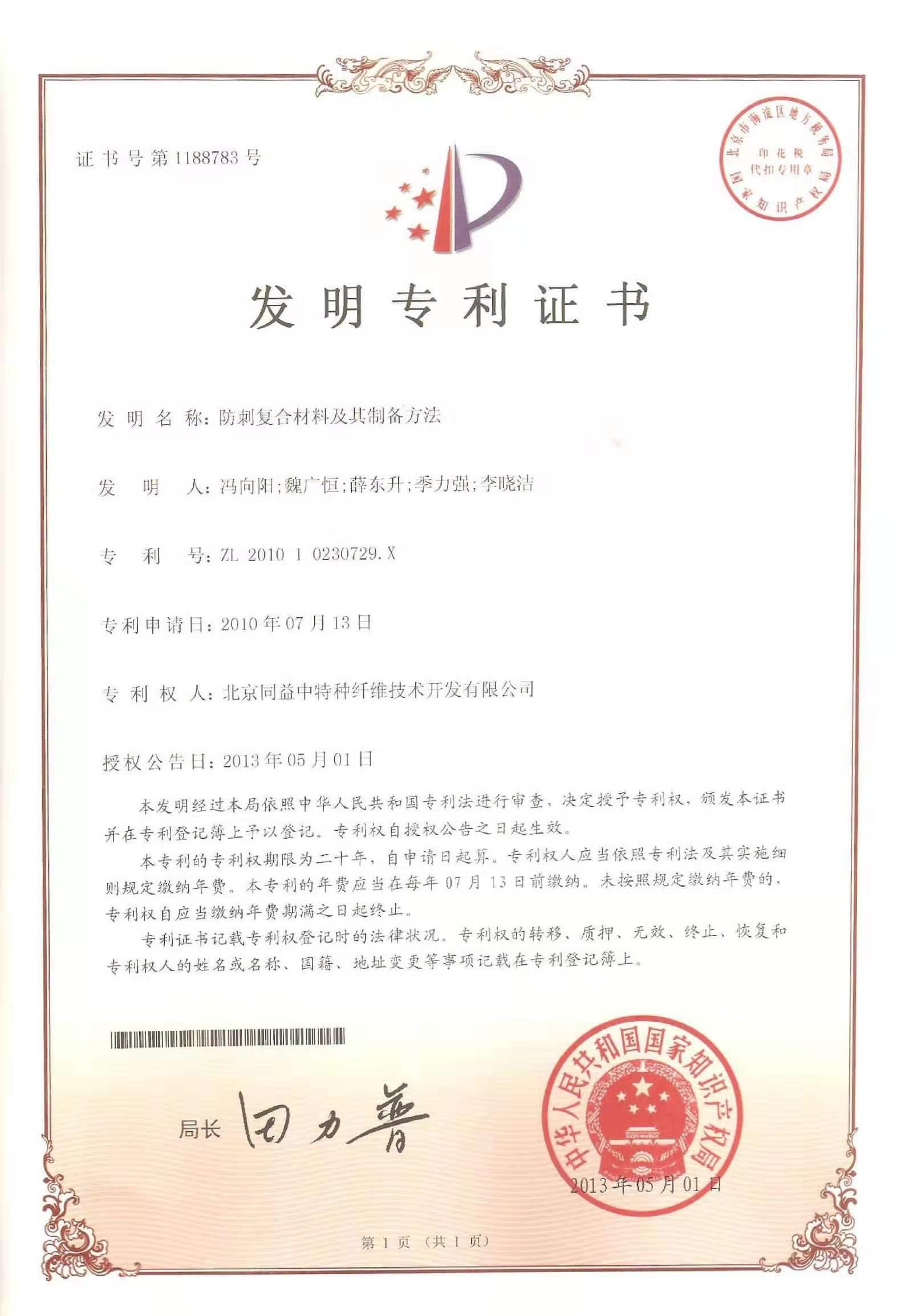 此外,公司主持起草的首個《超高分子量聚乙烯纖維長絲》行業標準已于2011年2月由國家工信部頒布實施。截止到2018年年底,公司累計申請了74項專利,涵蓋了PE纖維,PEUD,防彈插板和防彈頭盔等產品,其中45項專利已經獲得了授權包括美國專利,歐洲專利,韓國專利等PCT成員國專利。