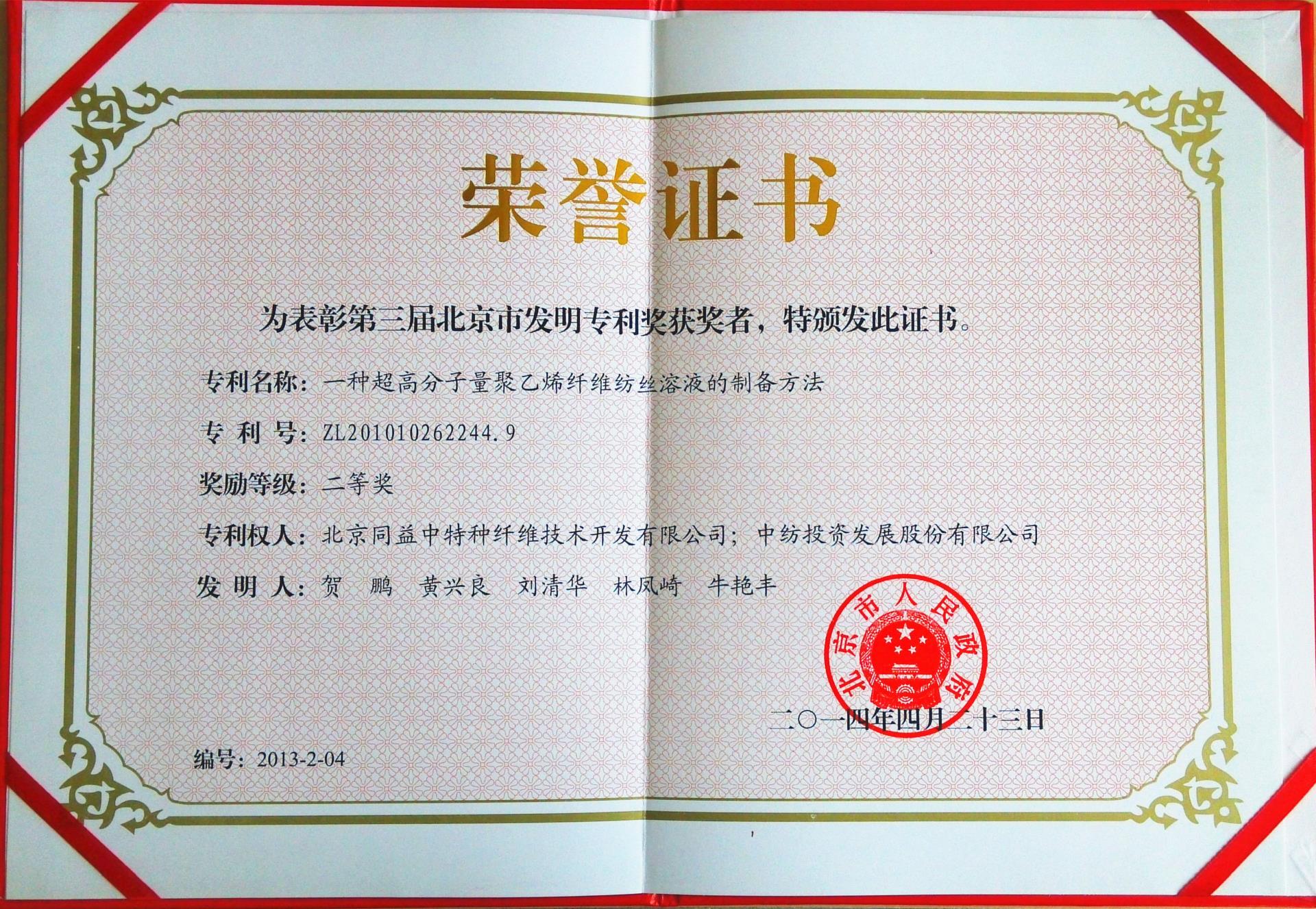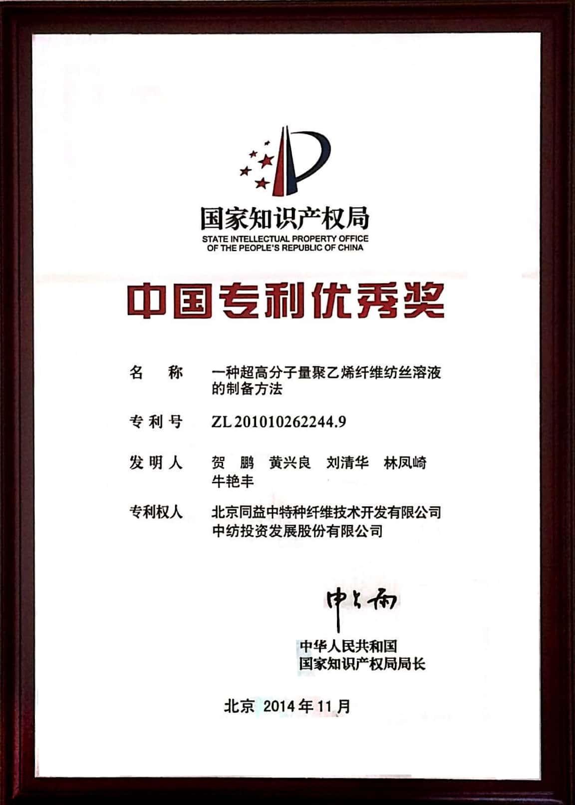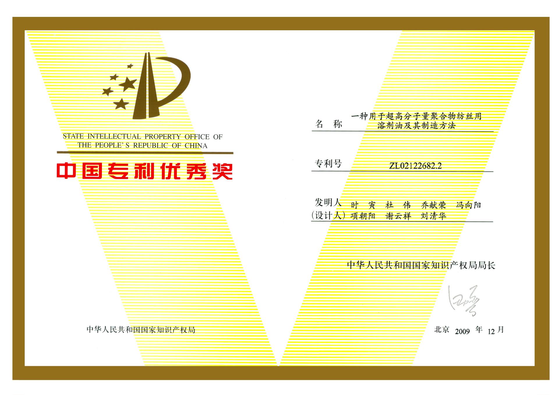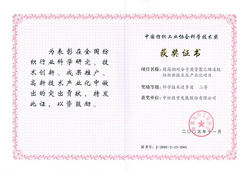 公司研發團隊設計了具有自主知識產權的超高分子量聚乙烯干噴濕法凍膠紡絲超倍熱牽伸工藝技術及其配套生產設備,實現了工程化集成配套和環保達標,整體技術及產品處于國際先進、國內領先水平。該項目通過了國家紡織工業協會的驗收鑒定,研究成果榮獲2009年度國家科學技術進步二等獎及2009年度中國專利優秀獎。